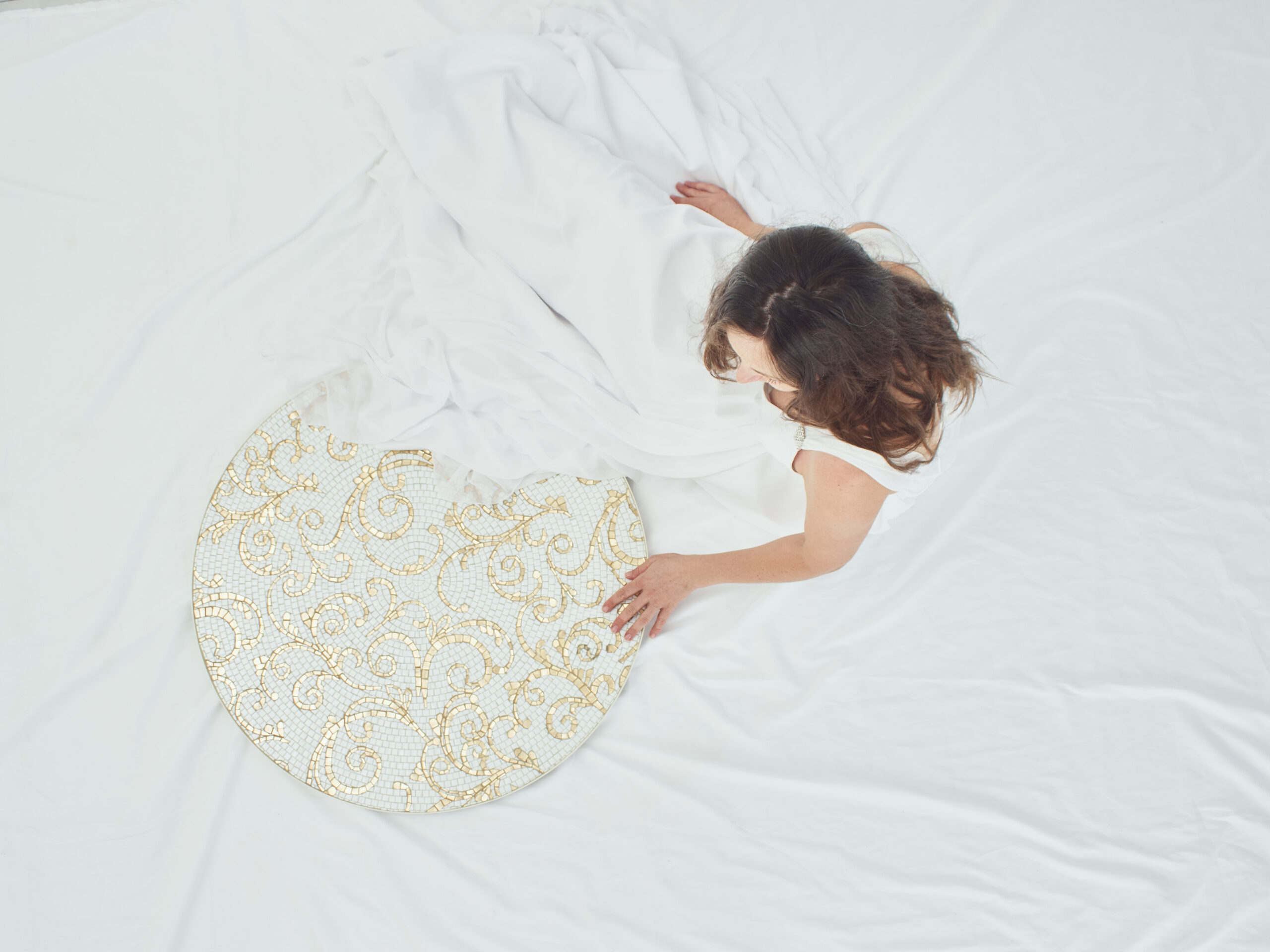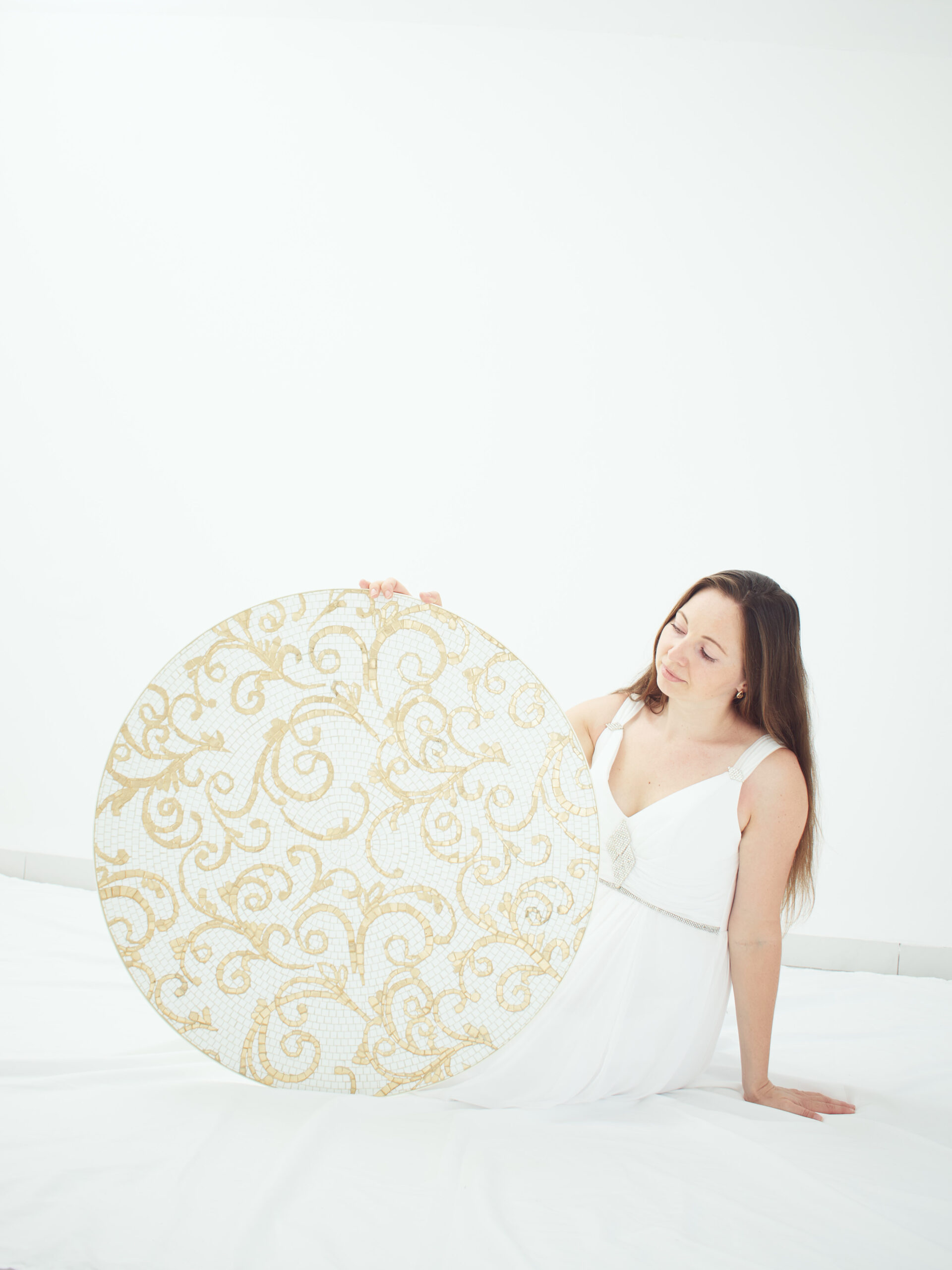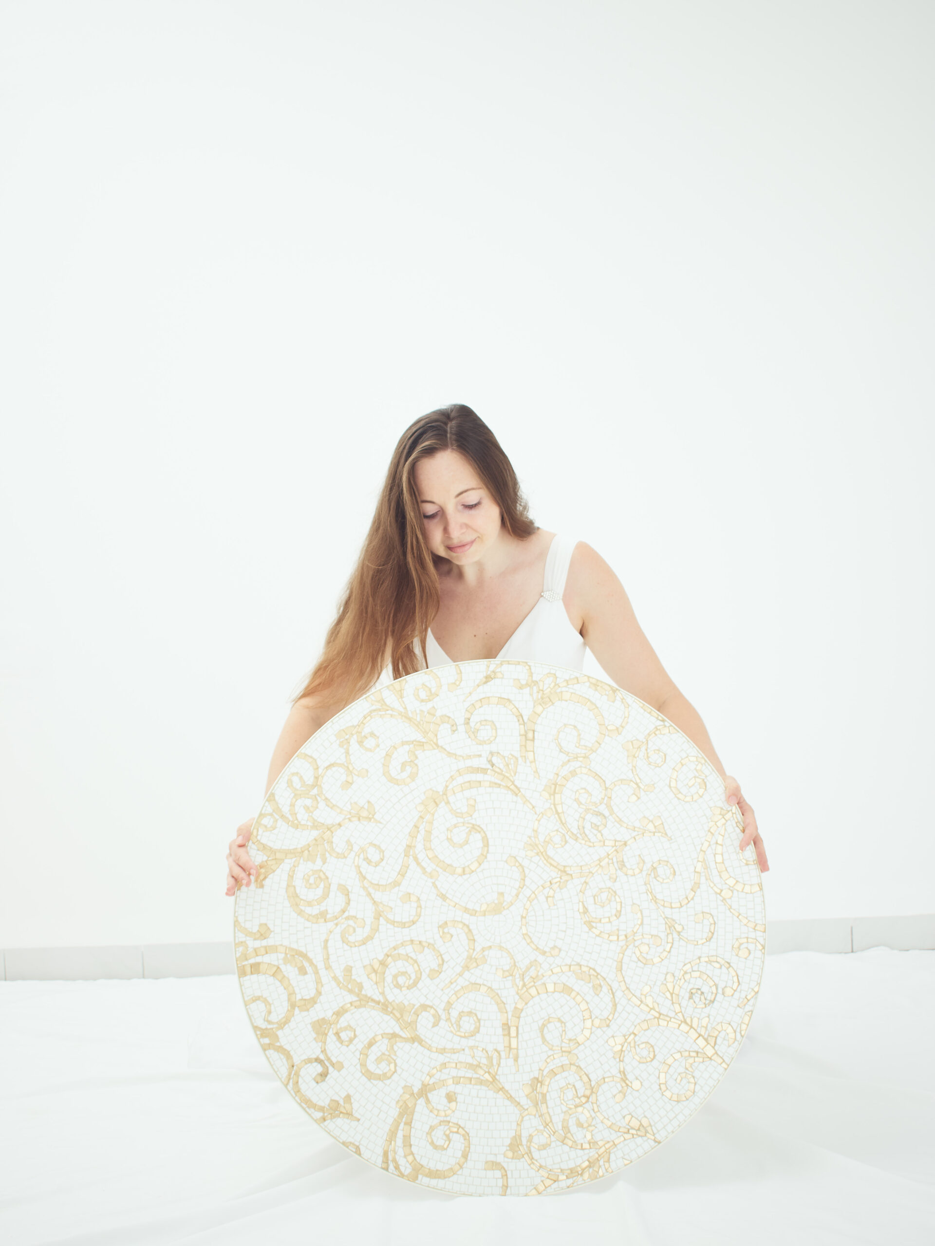 ציפוי פלטה מפסיפס זכוכית . 2 צבעים – לבן וזהב.