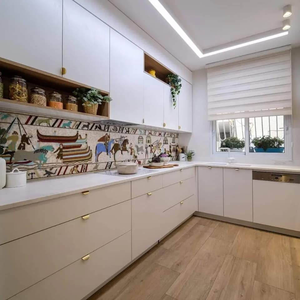 Воплощение в мозаике было решено применить для кухонного фартука с применением техники художественной колки. Разработка эскиза, примера, и создание всей мозаики заняло несколько месяцев, однако результат превзошел все ожидания.