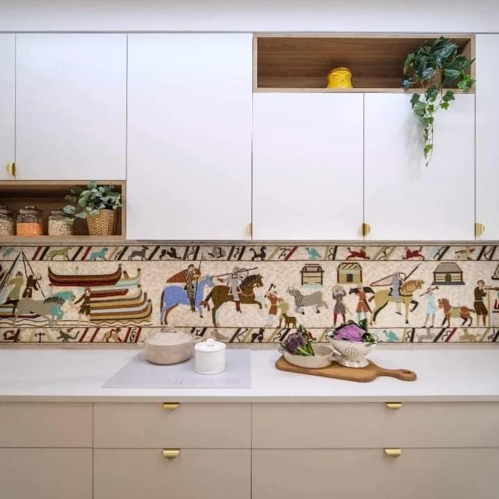 Клиенты обратились с собственной идеей. Восхитительный гобелен в французском городе Байо так им понравился, что было решено включить его изображения в новый интерьер.